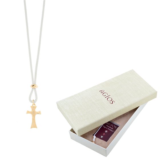 Collana religiosa con Tau dorato in confezione regalo con penna Questo elegante cofanetto regalo è perfetto come idea regalo per una comunione per una bambina e per un bambino, è una collana unisex. la collana è in corda cerata di colore bianco con pendente Tau in argento dorato. La lunghezza del girocollo si adatta a tutti grazie alla possibilità di regolazione tramite nodi scorsoi. confezione regalo perfetta per la Prima Comunione collana in tessuto bianco argento 925/000 ciondolo Tau chiusura a moschettone la confezione regalo include una legante penna a sfera con inchiostro di colore nero, ed un piccolo libriccino di parabole "Ago