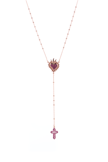Rosario in argento placcato rosè, con Sacro Cuore impreziosito di zirconi rubino. Lunghezza girocollo 46cm e finale pendente a croce con zirconi rubino.
