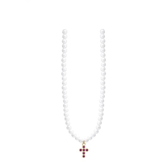 Collana Perle ICONA Crucis Collana perle di conchiglia con pendente a croce zirconi di 11mm finitura Dorata in Argento 925 con zirconi rossi
