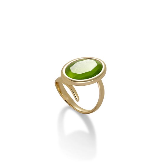Anello in AG 925‰ placcato oro giallo 23 kt. con pasta vitrea Verde occhio di gatto argento 925/000 placcatura in oro giallo 23 carati rivestimento con speciale trattamento che protegge dalla naturale ossidazione del metallo orgogliosamente fatto a mano in Italia placcature rigorosamente senza alcun rilascio di nichel e cadmio comfort fit