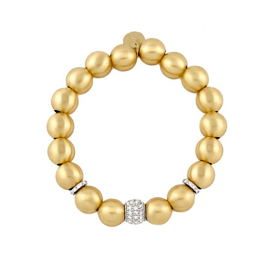 Bracciale elastico in filo di silicone con boule in argento 925 satinato placcate oro giallo 23kt. Il bracciale è impreziosito da sfere e anelli di zirconi bianchi.