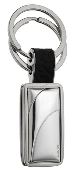 Portachiavi rettangolare in acciaio, pelle e placca in argento con finitura lucida e satinata.