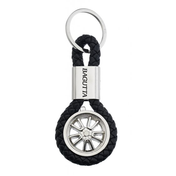 Portachiavi in acciaio on ruota, brisee e cordone in similpelle colore nero