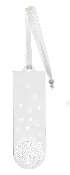 Segnalibro rettangolare con albero della vita e nastro in raso bianco.