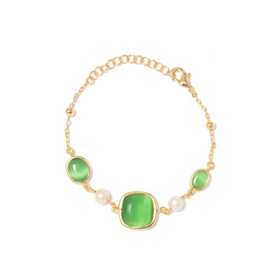 Bracciale placcato oro 18kt collezione Marie Cloe con fantasia pietre Quarzi Quadrato e ovali colorazione Verde e perle bianche creato a mano nei laboratori BLIND LAB da esperti artigiani orafi N.B Il bracciale ha una lunghezza standard di 16cm + estensione di 4cm