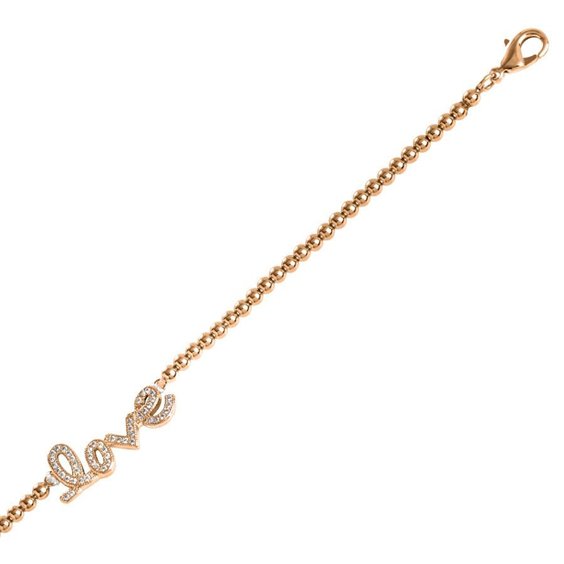 Bracciale a sfere in acciaio placcato oro rosa, con scritta centrale 'love' in zirconi. Lunghezza cm 18, estendibile fino a cm 21.
