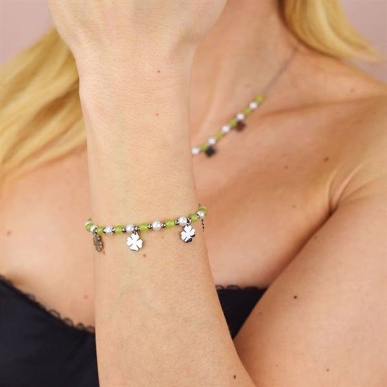 Bracciale con perle sintetiche e boules in acciaio rodiato, di colore verde, con pendenti rodiati a forma di quadrifoglio. Materiale: acciaio Misure: lunghezza da cm 16,5 a cm 20 Dimensione: diametro perla/boules mm 4 Chiusura: con moschettone Garanzia: 2 anni