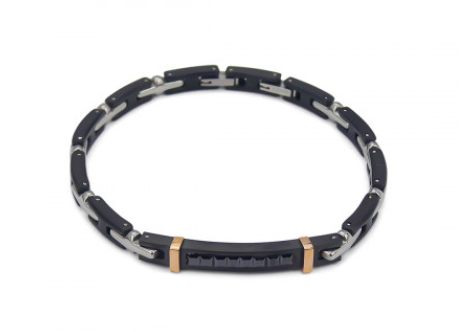 Bracciale modulare in acciaio con finiture in Pvd color oro, piastrina centrale con zirconi neri ed elementi decorativi in Pvd oro. regolabile togliendo maglie finali.