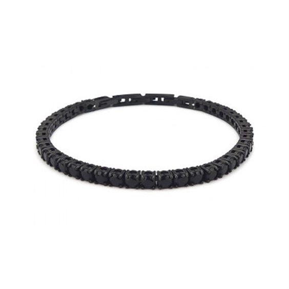 Bracciale tennis in Pvd nero con zirconi neri. Materiale: acciaio 316L anallergico nichel free Misure: lunghezza regolabile fino a cm 22 Chiusura: a scatto Garanzia: 2 ann