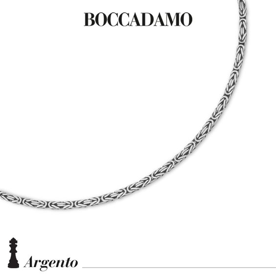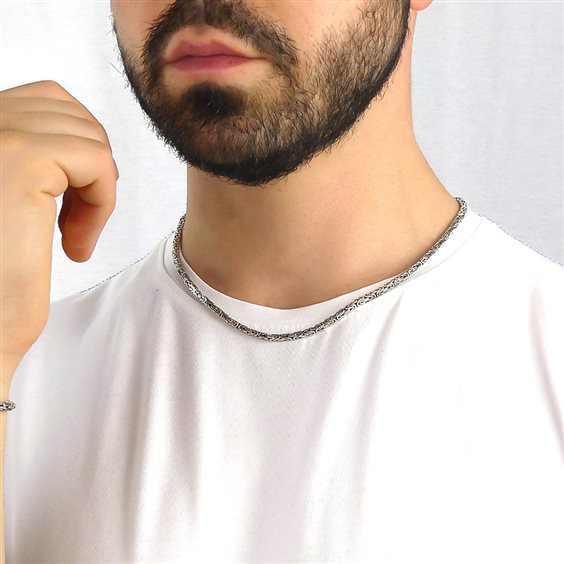Collana catena a maglia bizantina quadrata in argento brunito. Materiale: argento 925 Produzione: lavorato a mano in Italia Misure: lunghezza collana cm 50 Chiusura: con moschettone Garanzia: 2 anni