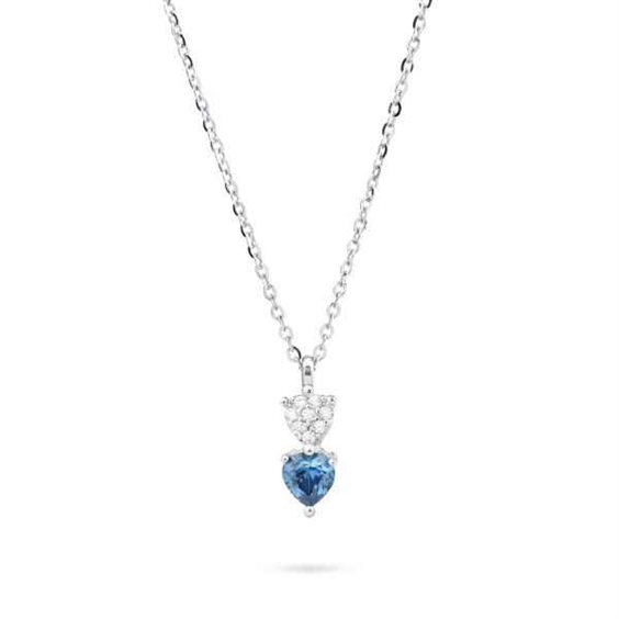 Collana in argento rodiato con pendente di due cuori di zirconi di colore bianco e azzurro. Materiale: argento Produzione: realizzato in Italia Misura: lunghezza cm 39 estendibile fino a cm 44,5 Dimensione: lunghezza pendente cm 1 Chiusura: moschettone Garanzia: 2 anni