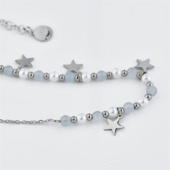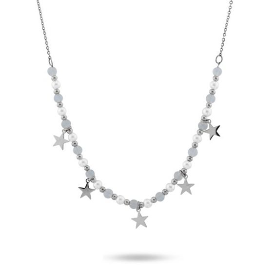 Collana con perle sintetiche e boules in acciaio rodiato, di colore bianco, con pendenti rodiati a forma di stelle. Materiale: acciaio Misure: lunghezza da cm 39 a cm 44,5 Dimensione: diametro perla /boule mm 4 Chiusura: con moschettone Garanzia: 2 anni