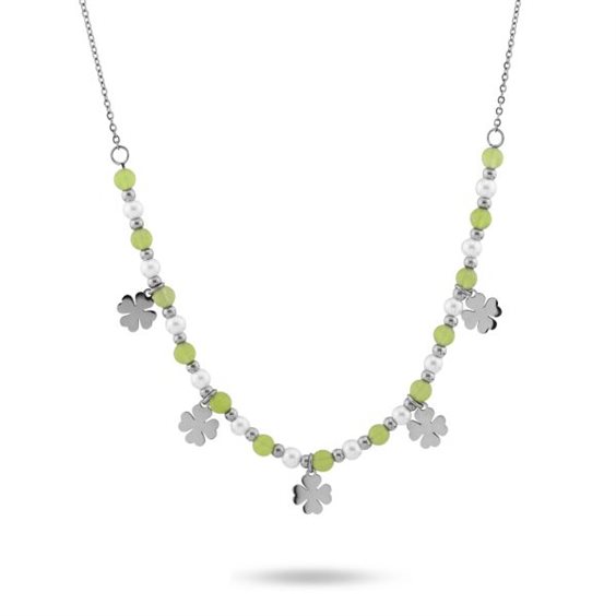 Collana con perle sintetiche e boules in acciaio rodiato, di colore verde, con pendenti rodiati a forma di quadrifoglio. Materiale: acciaio Misure: lunghezza da cm 39 a cm 44,5 Dimensione: diametro perla /boule mm 4 Chiusura: con moschettone Garanzia: 2 anni