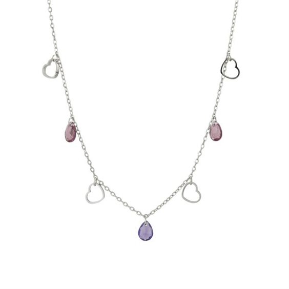 Collana in acciaio con pendenti traforati a forma di cuore alternati a cristalli di colore lilla. Materiale: acciaio e cristalli Produzione: realizzato in Italia Misure: lunghezza da cm 38,5 a cm 43,5 Dimensione: pendenti cm 0,8 Chiusura: con moschettone Garanzia: 2 anni