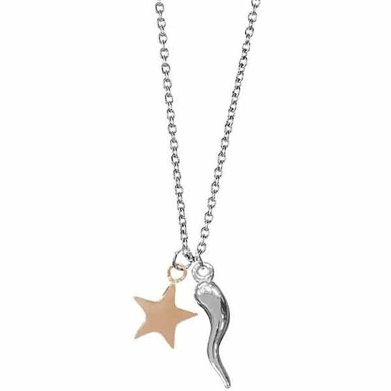 Collana in acciaio con cornetto portafortuna in bronzo rodiato e stellina in acciaio placcato oro rosa. Lunghezza cm 38, estendibile fino a cm 43,5.