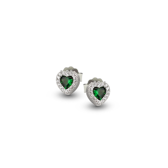 Orecchini a lobo rodiati con zircone color verde smeraldo taglio a cuore, avvolto da cuore in pavè di zirconi. Materiale: argento Produzione: realizzato in Italia Dimensione: cuore mm 6,4x6,4 Chiusura: a farfalla Garanzia: 2 anni