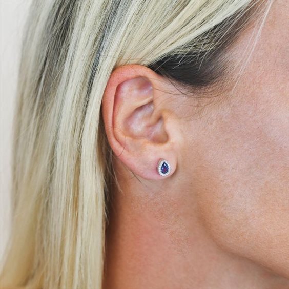 Orecchini rodiati a lobo con cristallo a forma di goccia, colore tanzanite, circondato da zirconi bianchi. Materiale: argento Design: made in Italy Dimensione: cristallo cm 0,5 Chiusura: a farfalla Garanzia: 2 anni