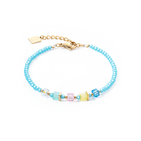 Bracciale Joyful Colours turchese-multicolore La collezione JOYFUL COLOURS continua a crescere con collane, orecchini e bracciali colorati, come il bracciale multicolore turchese Joyful Colours. Il design leggero e giocoso, con colori vitali che significano energia e voglia di fare, ci aiuta a diventare attivi. Non ne avrete mai abbastanza di questi stimolatori dell'umore! MATERIALE: Cristalli Swarovski® Occhio di tigre sintetico Vetro molato Acciaio inox oro LUNGHEZZA: 18 cm + 3 cm catenella di prolunga BLOCCO: Chiusura a moschettone acciaio inox oro