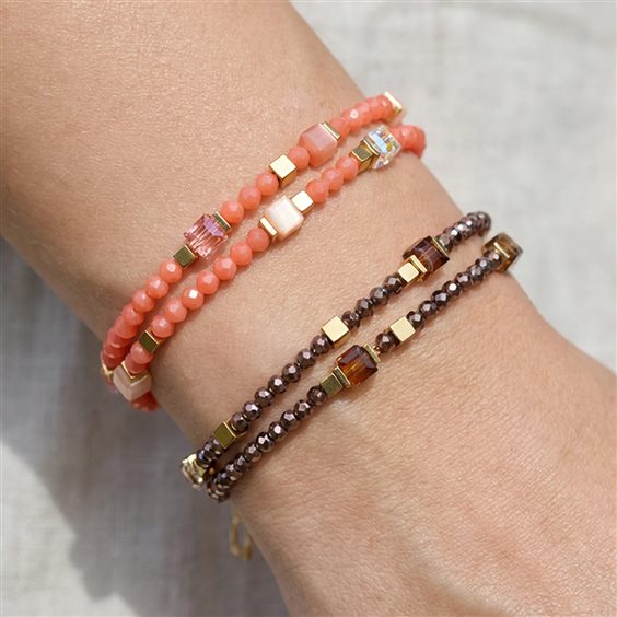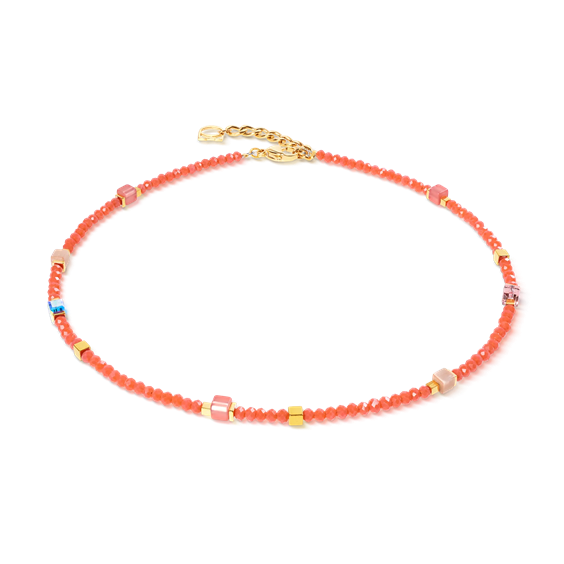 Joyful Colours Flex Bracciale oro-arancione MATERIALE: Cristalli Swarovski® Ematite Occhio di tigre sintetico Polaris Vetro molato Acciaio inox oro BLOCCO: Chiusura a moschettone acciaio inox oro Indossato a doppio giro sul polso, il bracciale appare leggero ma ben strutturato. Portato come choker, con una lunghezza di circa 35–37,5 cm, assume un’espressione più pulita, attuale e molto versatile