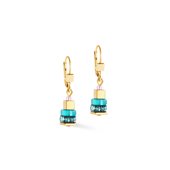 Orecchini Boho Sunset Cube rainbow MATERIALE: Rondella strass Polaris Ematite con finitura in ossido di titanio Acciaio inox oro LUNGHEZZA: 3 cm BLOCCO: Orecchini pendenti argento sterling dorato