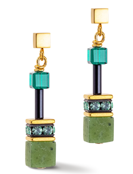 Orecchini GeoCUBE® Iconic Precious verde All'insegna del verde, questi eccezionali orecchini GeoCUBE® con vere pietre come l'avventurino verde, regalano armonia a chi li porta. Ogni gioiello che ordini da COEUR DE LION viene adagiato di una pregiata custodia di design e consegnato con un certificato di autenticità. MATERIALE: Nefrite Cristalli Swarovski® Rondella strass Acciaio inox oro LUNGHEZZA: 3.2 cm BLOCCO: Orecchini a buco acciaio inox oro