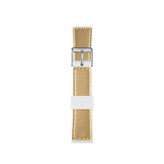 Chiusura La chiusura è a fibbia in acciaio e può essere regolata facilmente in modo da adattare la grandezza dell’orologio a qualsiasi polso Cinturino Il cinturino è in silicone con inserto in pelle color oro per cassa MEDIUM misura: 75 x 112 mm
