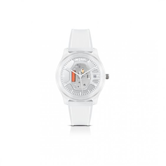 Orologio iam solo tempo in pvc cinturino silicone. Taglia m. Cassa in policarbonato effetto metallo o trasparente, dimensione 36mm. Quadrante con indici e logo stampato. Porta-movimento in abs. Fondello in acciaio. Movimento japan miyota 2035. Cinturino in silicone. La chiusura è a fibbia in acciaio e può essere regolata facilmente in modo da adattare la grandezza dell'orologio a qualsiasi polso. Impermeabile 5atm. Dimensioni cassa 36 x 36 mm; cinturino 75 - 112 mm.