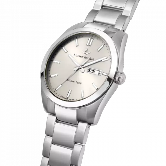 Materiale e finitura cassa Acciaio Misura cassa 41mm Spessore cassa 11.75 Finitura cassa Polished and satined Vetro Zaffiro Materiale cinturino Bracciale in metallo Colore cinturino Argento Chiusura Box buckle with pushers Water resistant 5 atm Garanzia Ufficiale 2 anni Lucien Rochat Confezione Originale Lucien Rochat