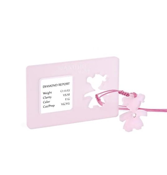 Ciondolo “Bimba” rosa con Diamante incastonato da 0.03 ct Ciondolo “Bimba” rosa con Diamante incastonato, un regalo prezioso per custodire i primi istanti di vita del bambino, momenti che ogni mamma terrà per sempre nel suo cuore. La confezione contiene: un Ciondolo con Diamante e una tavoletta in pasta FIMO dove poter imprimere la sagoma del piede o della mano del vostro bambino e conservarla nel tempo. Tipologia Diamanti Diamanti naturali taglio Brillante (Round) - 100% Made in Italy Colore: F/G Purezza: VS/SI1.