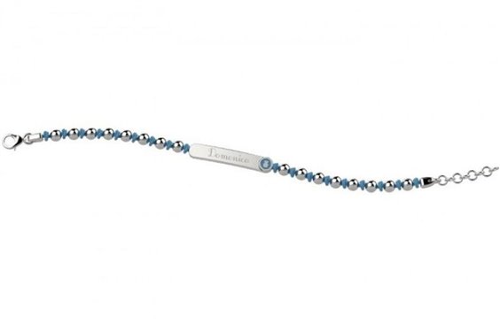 Braccialetto in argento e cordino nautico azzurro alternato palline e nodini, centrale una targhetta con un orsetto con lo smalto azzurro. Catenella finale per accorciarlo.