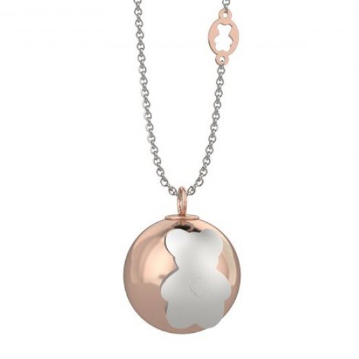 Collana chiama angeli con catena lunga in argento 925. Pendente a sfera in metallo rosato, e due orsetti color argento.