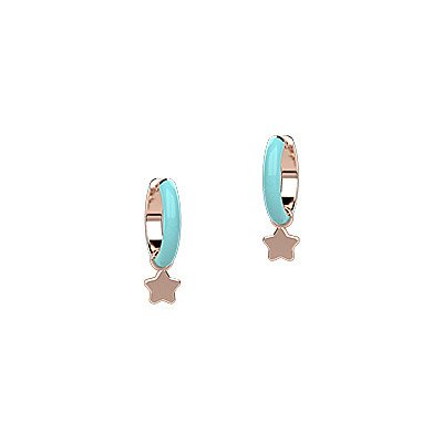 Orecchini a cerchio in argento 925 rosè smaltati celeste con stelline lisce pendenti. Chiusura a scattino