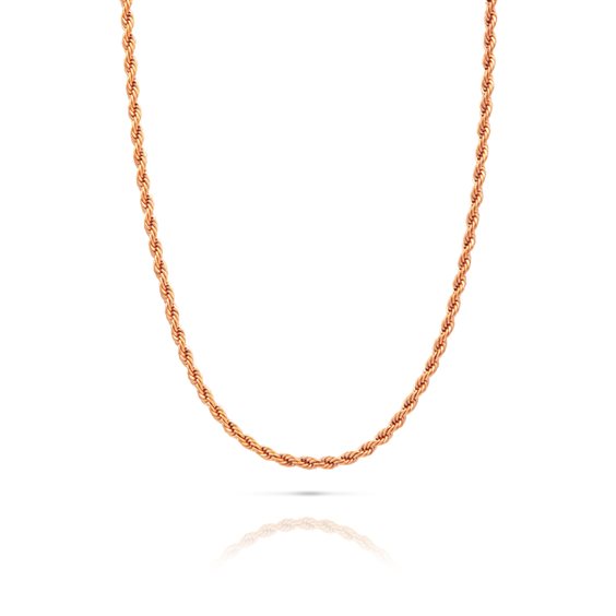 “Collana in maglia torchon in acciaio lucido con trattamento PVD oro giallo e oro rosa. Personalizzata con cuore OPS. Spessore catena 4 mm. Lunghezza 38 cm regolabile a 44 cm.”