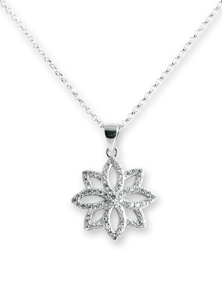 Girocollo in argento 925 rodiato con pendente di zirconi bianchi a forma di fiore. Lunghezza della collana cm 42 con cm3 di allungo.