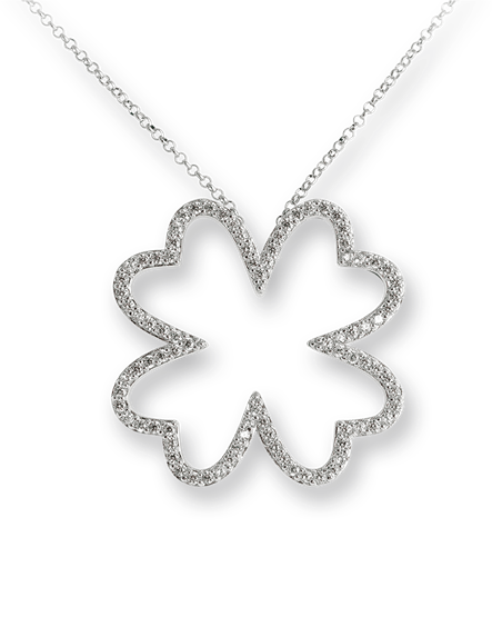Collana in argento 925 rodiato con pendente a forma di quadrifoglio con zirconi bianchi incastonati. La collana è lunga cm58 più 10cm di allungo.