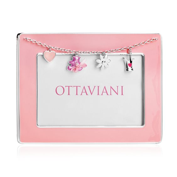 Cornice portafoto orizzontale in metallo smaltato colore rosa arricchita da una catenella con appesi quattro charms smaltati a forma di cuore, orsacchiotto, fiore e corona. Misura esterna cm 14x19 Misura interna 10x15