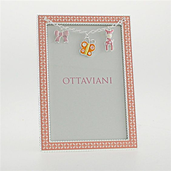 Cornice portafoto in metallo smaltato colore rosa pesca arricchita da una catenella con tre charms smaltati a forma di fiocco, farfalla e giraffa. Misura esterna cm 14x20 Misura interna cm 13x18