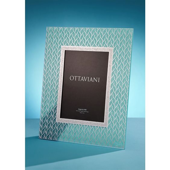 Portafoto cristallo "cachemire" Bellissima cornice in cristallo colorato color turchese/verde acqua con decoro color argento. Retro in legno bianco. Possibilità di poterla esporre sia in verticale che orizzontale misure interno cm 13x18; esterno cm 24,5x29,5