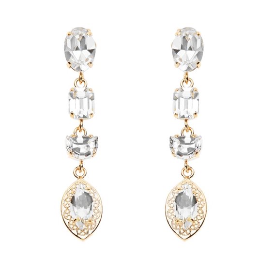 Orecchini in lega metallica dorata ideati e realizzati da Ottaviani impreziositi da cubic zirconia bianchi, lunghezza 7,1 centimetri, larghezza 1,3 centimetrI, peso 12 grammi, chiusura a farfallina.