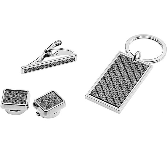 Set regalo da uomo in acciaio e fibra di carbonio composto da - portachiavi - copribottoni - fermacravatta