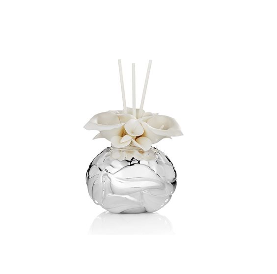 Profumatore in ceramica argentata e ceramica bianca con fragranza e bastoncini inclusi. Altezza cm10, larghezza cm10
