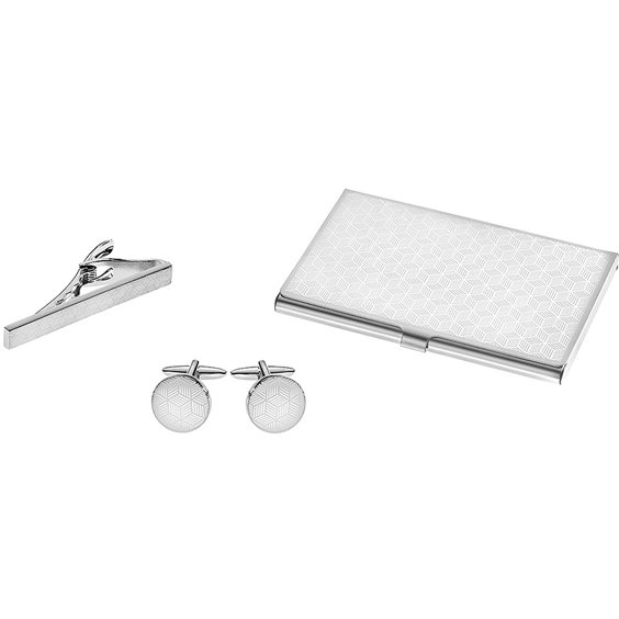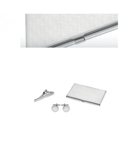 Set regalo da uomo in acciaio con lavorazione serigrafata composto da: - porta biglietti da visita - gemelli - fermacravatta