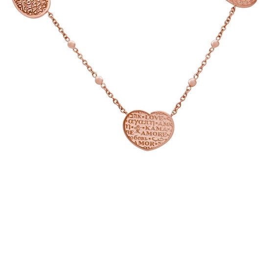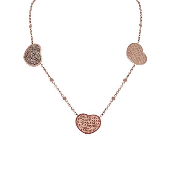 Girocollo corto in oro rosa 18 kt con tre cuori piatti con incisa a rilievo la parola AMORE in tutte le lingue del mondo. Chiusura con moschettone e lunghezza regolabile