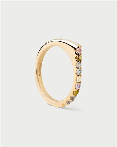 Anello Multicolor Oda Anello geometrico con una fila di zirconi colorati Materiale: Argento sterling Finitura: Placcatura in Oro 18K Pietra: Zirconi multicolori, vetro ceramico Larghezza: 1,5 mm Altezza: 20,1 mm Peso: 2 g