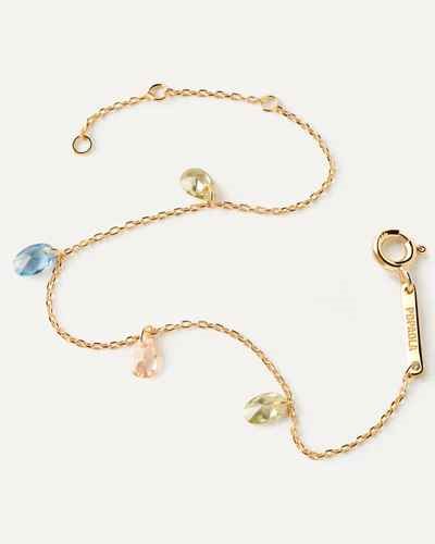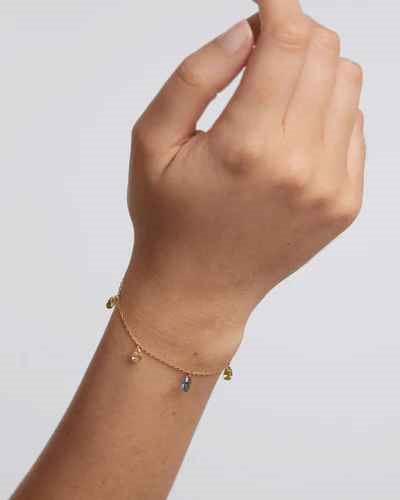 BRACCIALE BLOOM Materiale: argento sterling Finitura: placcatura in oro 18k Pietre: zirconi verde oliva, zirconi pesca, zirconi blu cielo, zirconi verde lime Lunghezza della catena: chiusura regolabile da 150 cm a 180 cm Dimensione della pietra: 6 mm Peso: 1,34 g