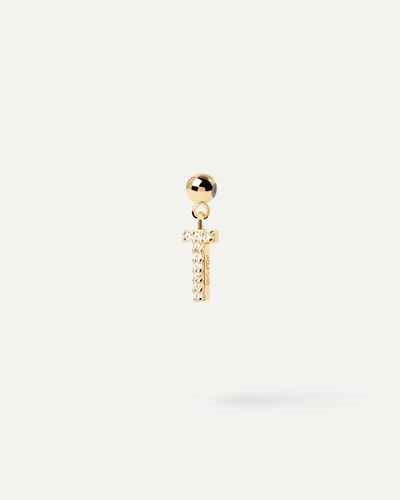 Materiale: argento sterling Finitura: placcatura in oro 18k Pietra: zirconi bianchi Misura del charm: 7 mm x 3 mm Peso: 0,44 g