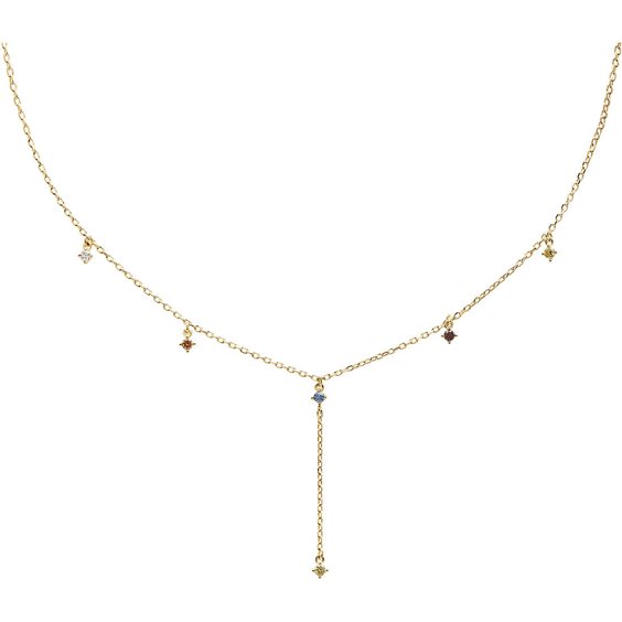 Collana da donna di PDPaola della collezione five. Collana con pietre: corindone blu zaffiro, zirconi rodoliti, zirconi champagne, zirconi giallo oro, zirconi bianchi puri, catena: regolabile; chiusura da 40 a 55 cm. Peso: 2,3 g. Gioiello realizzato in argento sterling 925 con placcatura oro 18k