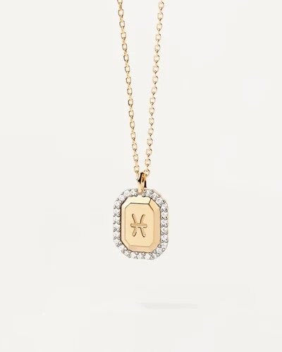MATERIALE: Argento sterling FINITURA: Placcatura in oro 18K PIETRE: Zirconi bianchi DIAMETRO DELLE PIETRE: 1 mm DIMENSIONI DEL CIONDOLO: 11,8 x 9,2 mm LUNGHEZZA DELLA CATENA: Chiusura regolabile da 40 mm a 50 cm PESO: 3,5 g