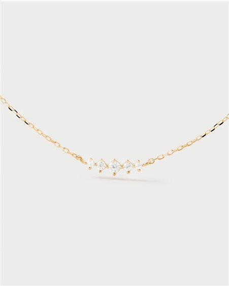 Collana Estela Materiale: Argento sterling Finitura: Placcatura in Oro 18K Pietre: Zirconi bianchi Altezza delle motivo: 1,5 mm Larghezza delle motivo: 12,5 mm Lunghezza della catena: Chiusura regolabile da 40 cm a 60 cm Peso: 3,68 g