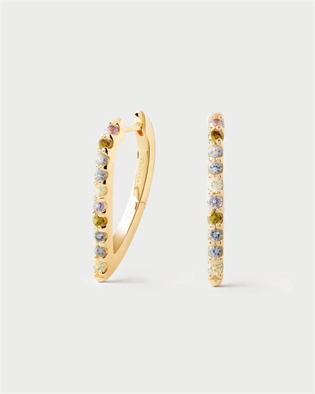 Orecchini a cerchio Multicolor Gloss Orecchini a cerchio geometrici con forma ovale e zirconi colorati Materiale: Argento sterling Finitura: Placcatura in Oro 18K Pietra: Zirconi multicolori, vetro ceramico Altezza: 22 mm Larghezza: 2 mm Lunghezza: 14 mm Peso: 4 g